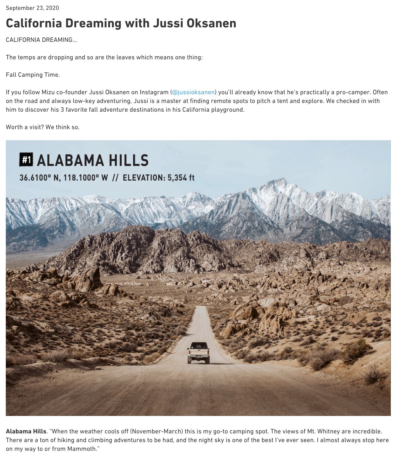 Mizu co-founder Jussi Oksanen is a master at finding remote spots to pitch a tent and explore. We checked in with him to discover his 3 favorite fall adventure destinations in his California playground.